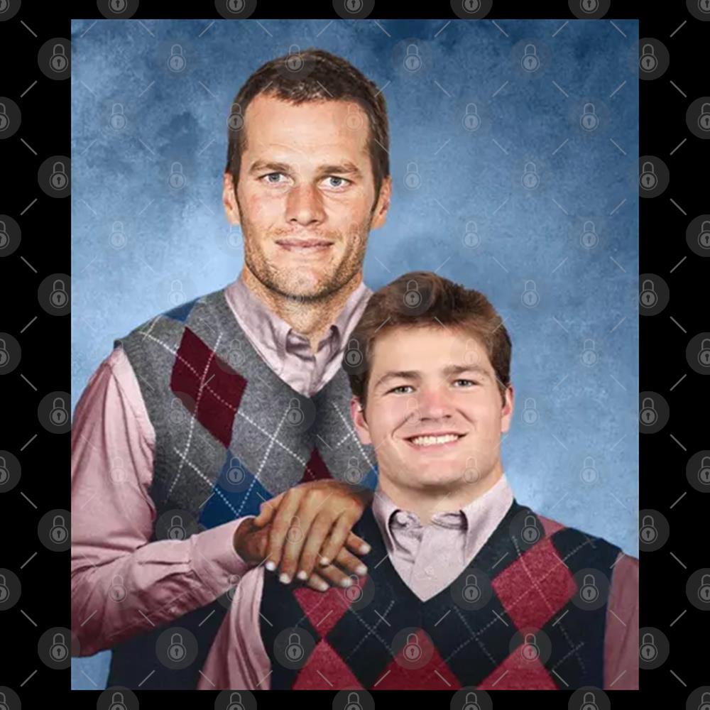 The design features Brady and Maye posed in a classic family portrait style, reminiscent of the “Step Brothers” movie poster. Dressed in matching argyle sweater vests over collared shirts, they stand against a soft, cloudy backdrop, blending sports culture with cinematic humor.