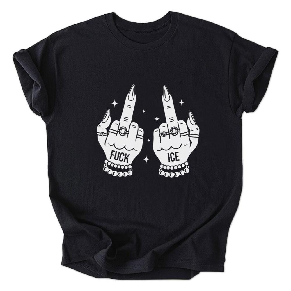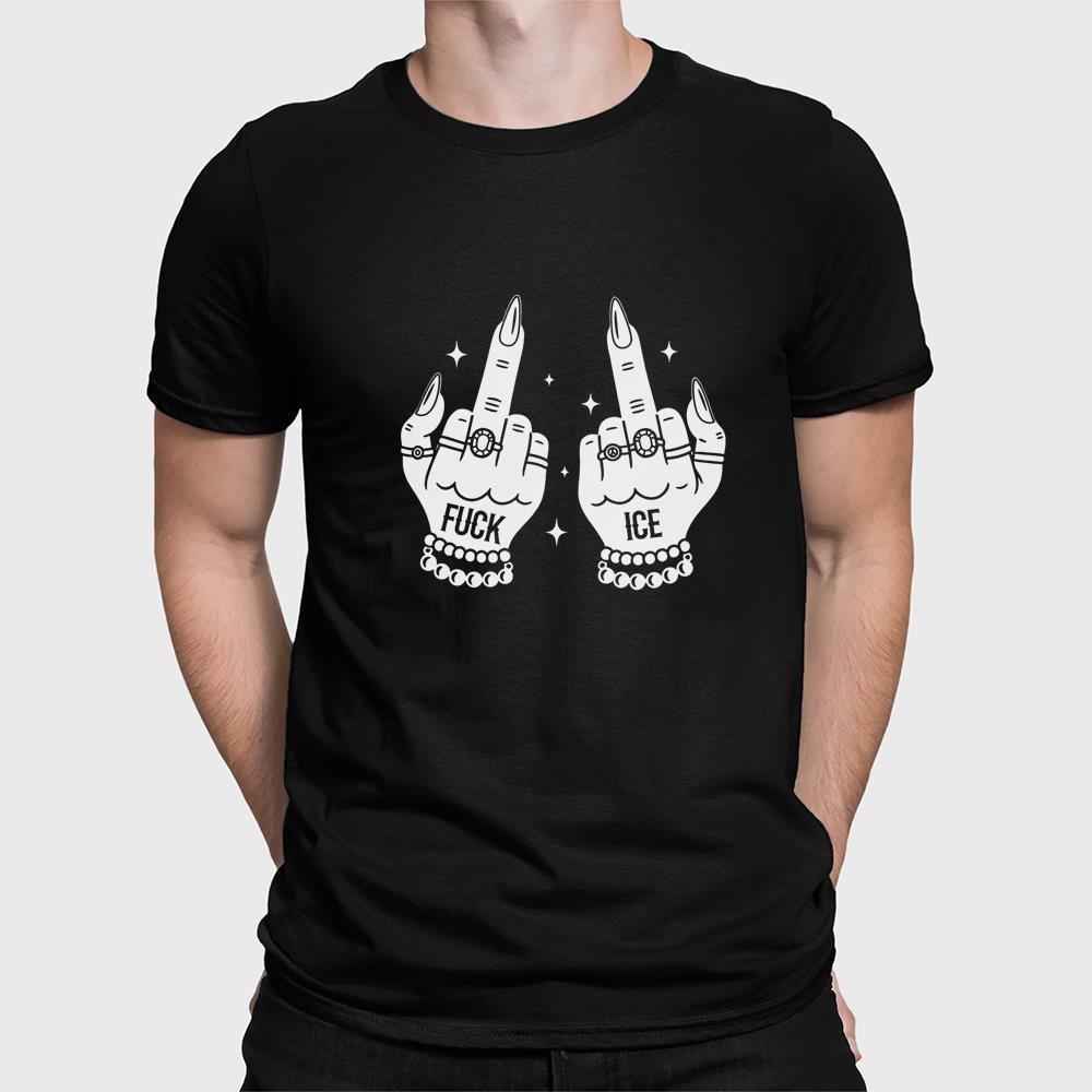 The design features a bold graphic of a raised middle finger, symbolizing defiance, with the words “F*ck ICE” prominently displayed. The stark contrast between the graphic and the shirt’s background ensures the message is unmissable, making it a powerful piece of protest apparel.
