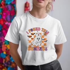 The shirt features an adorable ghost proudly holding a humerus bone, accompanied by the witty phrase ‘I Found This Humerus.’ Set against a backdrop of subtle spiderwebs, the design balances eerie elements with lighthearted charm, making it a standout piece for the season.